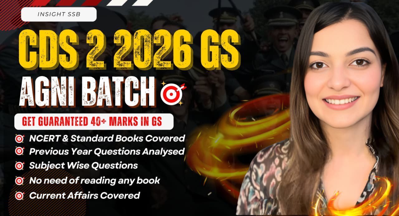 Most difficult part of CDS preparation is GS that is absolutely unpredictable with long Book list.. What if I tell you CDS is predictable and max questions are repeated from a particular section. In this course we will help you to Study Smart & do only what comes in Exam. You will Clear this exam in this very attempt this is our guarantee . Just follow everything told in the course properly. Insight SSB is known for the SMART WORK & we will make it possible for you as well. Let's Crack this exam together !! GET ENROLLED NOW!! 1- Full GS Content Available ( Video Lectures ) 2- TEST Series Included 3- Monthly Current Affairs included 4- Live Doubt Session as per Timetable Included This is GS course for combine defence services examination. This course will help you in learning only that which will be helpful for in your written examination. This is a properly organised course which will make you achieve 40+ marks in GS if you follow our course completely. Also we will be holding doubt sessions specially for students. We will cover important current affairs. You need to read no books , no notes , no newspaper after doing this course. The day you are enrolled in our course your selection is our responsibility. All the content will be added after CDS 2 2025 exam. This batch will begin after 15th September NOTE : Students have to make notes from Video lecture Courses as directed by Vaishalli Ma'am for Quick Revision. COURSES ARE NON - REFUNDABLE. Please call on 7982047997 for queries before Purchase.