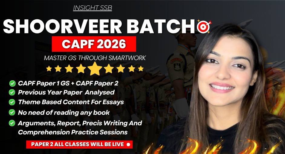 Only 100 Seats starts on 21st April How will we prepare for CAPF together ? For Paper 1 1- We will have both recorded as well as live classes. 2- Science being a subject which requires in-depth knowledge - we will cover it from 11&12 class as well 3- We will focus on most expected areas that are asked in the exam ( Studying only what comes in exam ) For Paper 2 Comprehensive Writing Skills Program Key Features 1. LIVE Sessions – Interactive, real-time classes with expert guidance and instant feedback. 2. Basic ‘How to Write’ Sessions– Learn essential writing techniques, structure, and clarity. 3.Complete Paper 2 Coverage- Covers Essay, Argument, Report, Precis Writing, and Comprehension. 4. Theme-Based Crisp Content – Concise, structured notes for effective and quick revision. 5. Doubt & Brainstorming Sessions – Dedicated sessions to clarify doubts and enhance critical thinking. 6. Comprehension via PYQs – Practice comprehension skills using past year questions for better accuracy. 7. Quotations, Data & Examples– Ready-to-use references to improve writing quality and impact. Note : For paper 2 - Live one on one evaluation of a test will be provided at the end. Make sure you submit test in time and select the slot of availability for evaluation. COURSES ARE NON - REFUNDABLE. Please call on 7982047997 for queries before Purchase.
